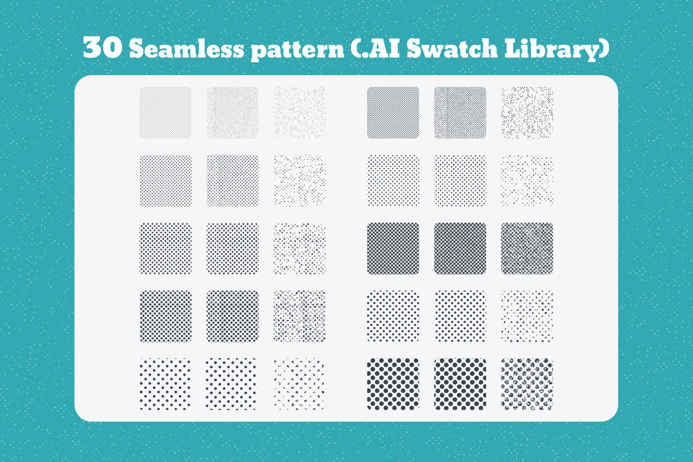This package is a set of 30 Seamless Tiled Halftone Pattern for Adobe Illustrator that enables you to easy create a variety of halftone design. All styles are easily customizable (Scale, Rotate and Recolor) allowing you to create your own unique effects. It’ll give your graphic in awesome retro feel.
