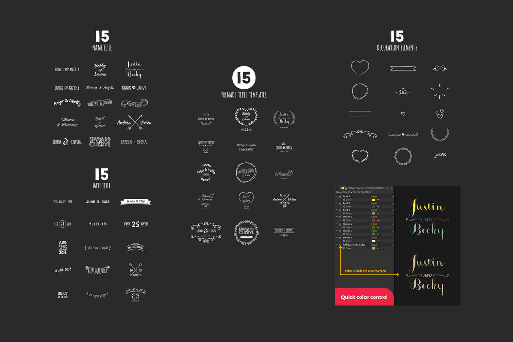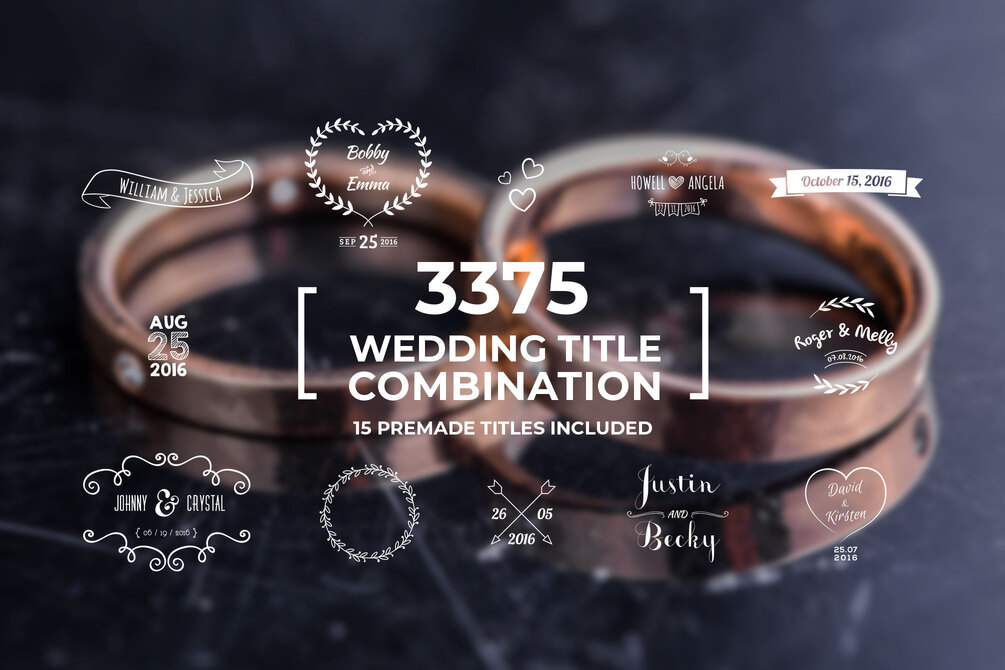 Elegant Wedding Title Combination Pack. It brings you 3,375 possible logo variations! Just choose your favorites, mix them up and just type your text and place them over your video.